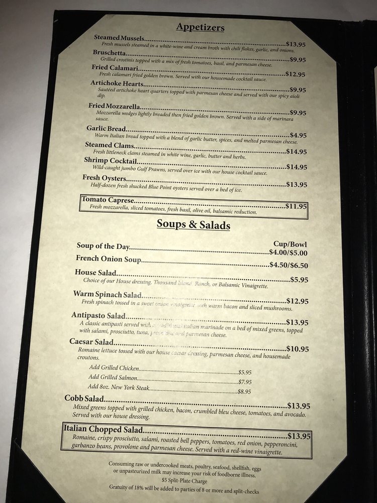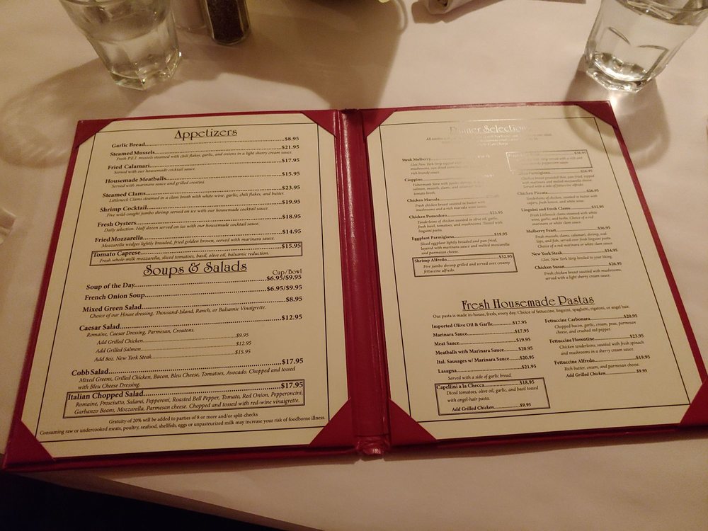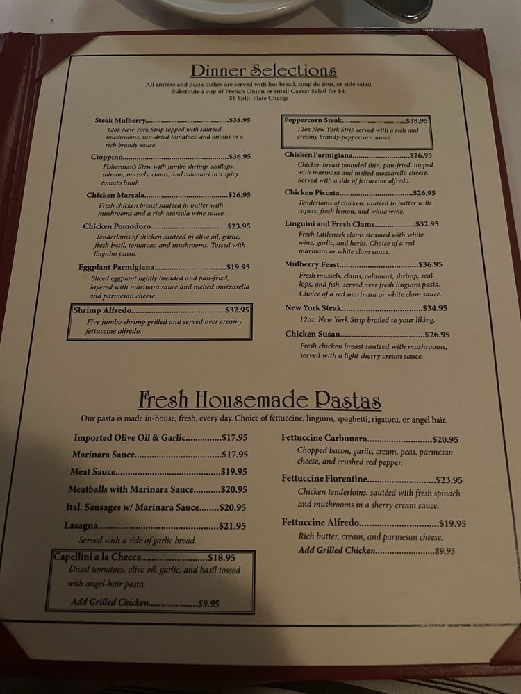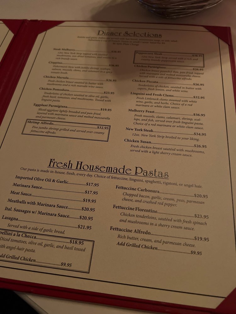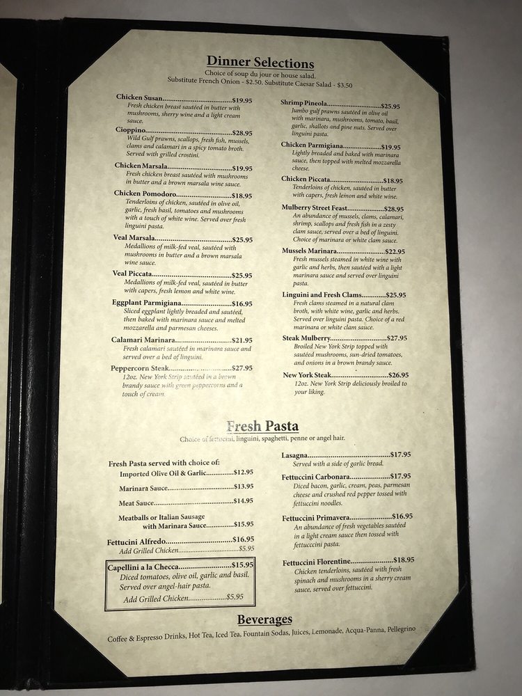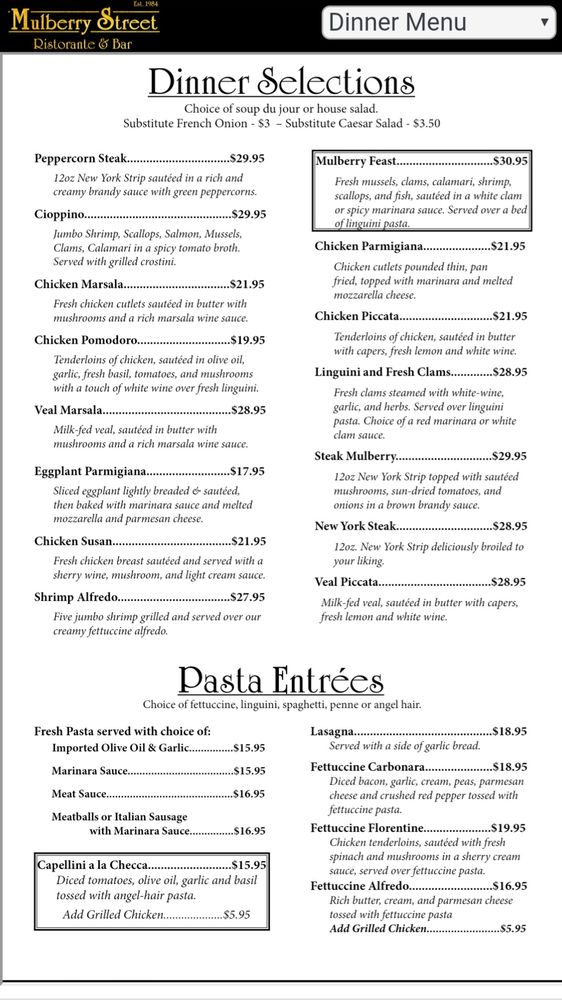 The highlight of Mulberry St. includes signature dishes like the Cioppino Fisherman’s Stew and Peppercorn Steak, each exuding rich flavors and fresh ingredients. The emphasis on quality is evident, with house-made pasta and delectable appetizers like Fried Calamari and Bruschetta.