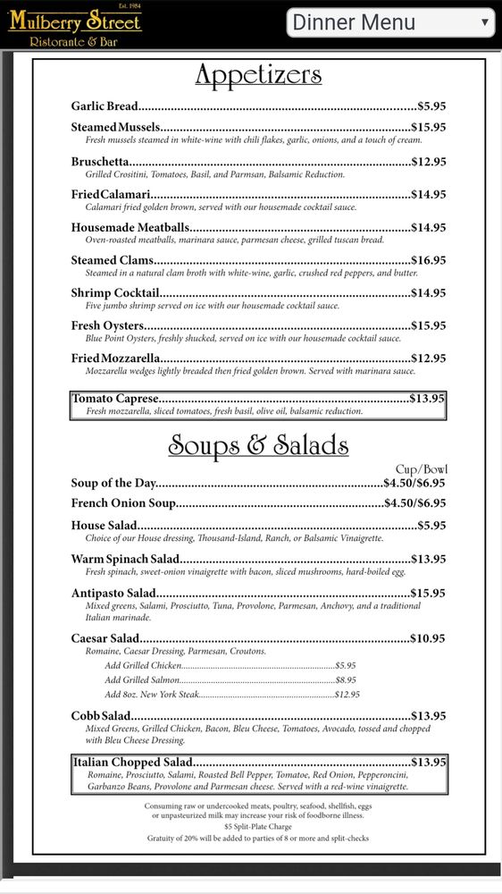 With a full bar and happy hour specials, it’s an ideal place for groups or casual dinners. Accessibility is also prioritized, featuring ADA-compliant facilities, making it welcoming for everyone. Whether you choose to dine indoors or enjoy the outdoor seating, your experience at Mulberry St. will undoubtedly be memorable.